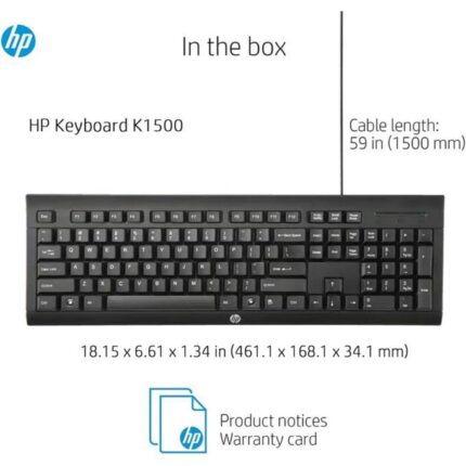 Le clavier HP K1500 est un clavier filaire AZERTY simple, conçu pour un usage bureautique quotidien, offrant une frappe silencieuse